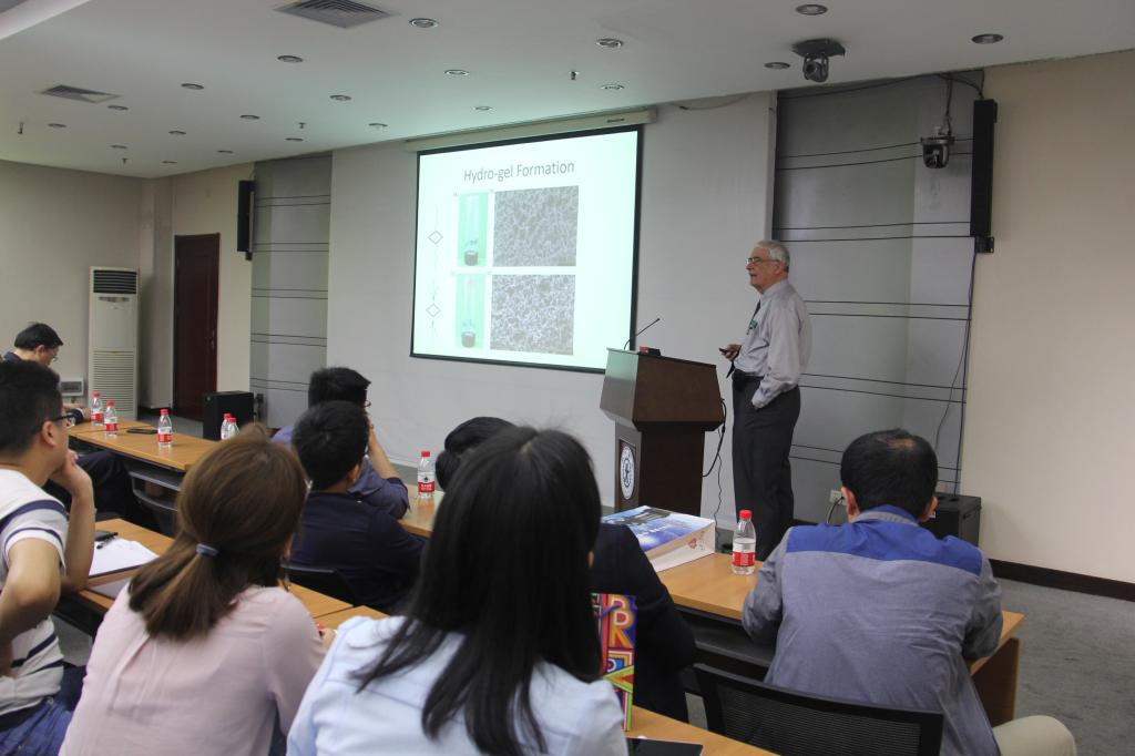 会后,Stang院士于科学馆207作题为“Abiological Self-Assembly: Predesigned Metallacycles and metallacages via Coordination”的精彩报告。Stang院士用形象生动的例子介绍了精妙的科学理念及方法,并用幽默的语言解释了通过分子自组装形成有着良好的几何构型与空间排列的离散超分子的科学问题,赢得了现场同学们的阵阵掌声。
