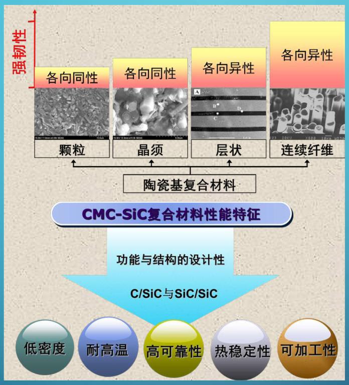 接着,张博士从学术的角度重点讲解了陶瓷基复合材料及制品的研制和开发,他首先向大家介绍了CMC-SiC材料的性能,即连续纤维增强陶瓷基复合材料,主要目的是克服陶瓷的脆性,简单形象的将CMC-SiC材料分为骨架型和皮肉型,简单易懂,根据CMC-SiC材料材料的性能特点列举了很多实际的在航空航天方面上的应用,例如太空反射镜,高温构件,刹车材料等。