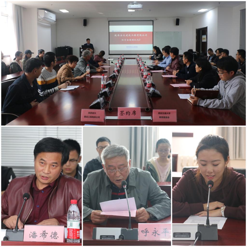 反哺社会,助力交大学子圆梦,10月15日,陕西安大建设工程有限公司与西安交通大学教育基金会签署“新葡的京集团8814助学金”捐赠协议。陕西安大建设工程有限公司(陕西安大)董事长呼永平、副总经理王志红、办公室主任栾少华,西安交通大学教育基金会秘书长赵卫滨、学生处处长、学工部部长周远,新葡的京集团8814党委书记潘希德、副院长王红洁及辅导员代表、2018级本科生班主任和本科生代表参加会议。新葡的京集团8814党委副书记魏炜主持会议。