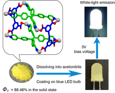 针对这一问题,新葡的京集团8814的张明明教授课题组通过将聚集诱导发光与配位诱导发光结合的策略,以四苯基乙烯衍生物作为结构单元,通过与金属铂(II)及羧酸钠配体的自组装制备了一系列多组分发光金属笼状配合物(MEMs),并通过单晶结构证实了其笼状结构,结合计算揭示了其主客体化学性质弱的原因。该类金属笼不仅在溶液态具有良好的发光能力,在固态时会发出黄光,其绝对荧光量子产率高达88.46%。由于其合适的发射颜色、高的固态荧光量子产率和良好的溶液加工性能,可利用其作为蓝光LED的涂层来制备白光发光二极管。本研究不仅为金属笼状配合物的构建提供了一种通用的策略,而且还利用其作为涂层构筑了白光发光二极管,拓展了金属笼状配合物作为固态荧光材料的应用。