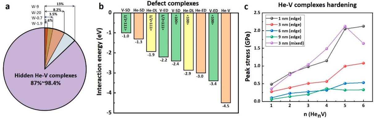 聚变能是人类理想的未来能源之一。钨、钼、钒等难熔金属是聚变堆的关键结构材料。这类金属具有体心立方结构,在高能粒子辐照后通常表现出超过100%的辐照硬化,远高于面心立方和密排六方金属。钨是聚变堆面向等离子体第一壁和偏滤器的最佳候选材料,它具有高熔点、良好的热导率、低氚滞留率和低溅射率。在聚变堆中,钨会经受高能粒子辐照和高热流轰击,氢、氦等被注入钨中,与辐照产生的空位结合形成气泡,使钨发生辐照硬化。然而,基于电镜观察到的纳米尺度辐照缺陷(如气泡、空洞或位错环)并不能准确地评估这类辐照硬化。长期以来,研究者猜测,体心立方金属的超高辐照硬化与大量的不可见辐照缺陷有关。这类缺陷通常是原子尺度,区别于尺寸较大的缺陷团簇,如位错环、空洞或气泡,所以从实验上获得它们的尺寸、密度和强化效果非常具有挑战性。因此,不可见辐照缺陷-“暗物质”-硬化的假设一直缺乏直接的实现证据支撑。