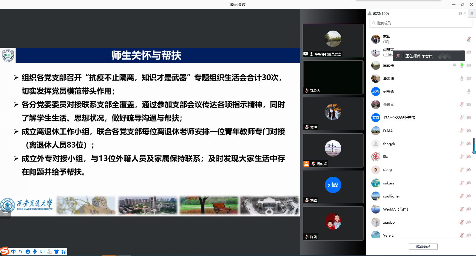 新葡的京集团8814院长单智伟通报了学院在疫情期间,学院围绕科研教学、学生管理、安全保障等方面采取了系列有效措施,做到战“疫”、工作两不误。其中成立院长和书记牵头的疫情专班,每晚定时期汇报当日工作进展,开会研讨当日工作进展,结合发现问题及时采取针对性措施;及时发布给各系室主任和支部书记会议纪要和工作简报,互通信息,做好机制保障;建立一支院领导为首、学生骨干为核心的工作队伍,对全体研究生实行网格化管理;班主任们开创了“云自习”模式,督促学生复习,做好学业帮扶;依托“周惠久论坛平台”,打造系列高端学术活动,丰富师生学术生活;人员及各系室负责人微信群,规范巡检信息反馈流程,时刻掌握实验室情况,做好实验室安全管理工作等。他还讲到除了全体教职工凝心聚力、共克时艰之外,材料学科校友会及社会爱心人士校友们、兄弟院校、企事业单位等也纷纷捐赠各类所需物资,送上暖暖的关心与问候,共同筑牢疫情防控堡垒,一起守得云开见月明。