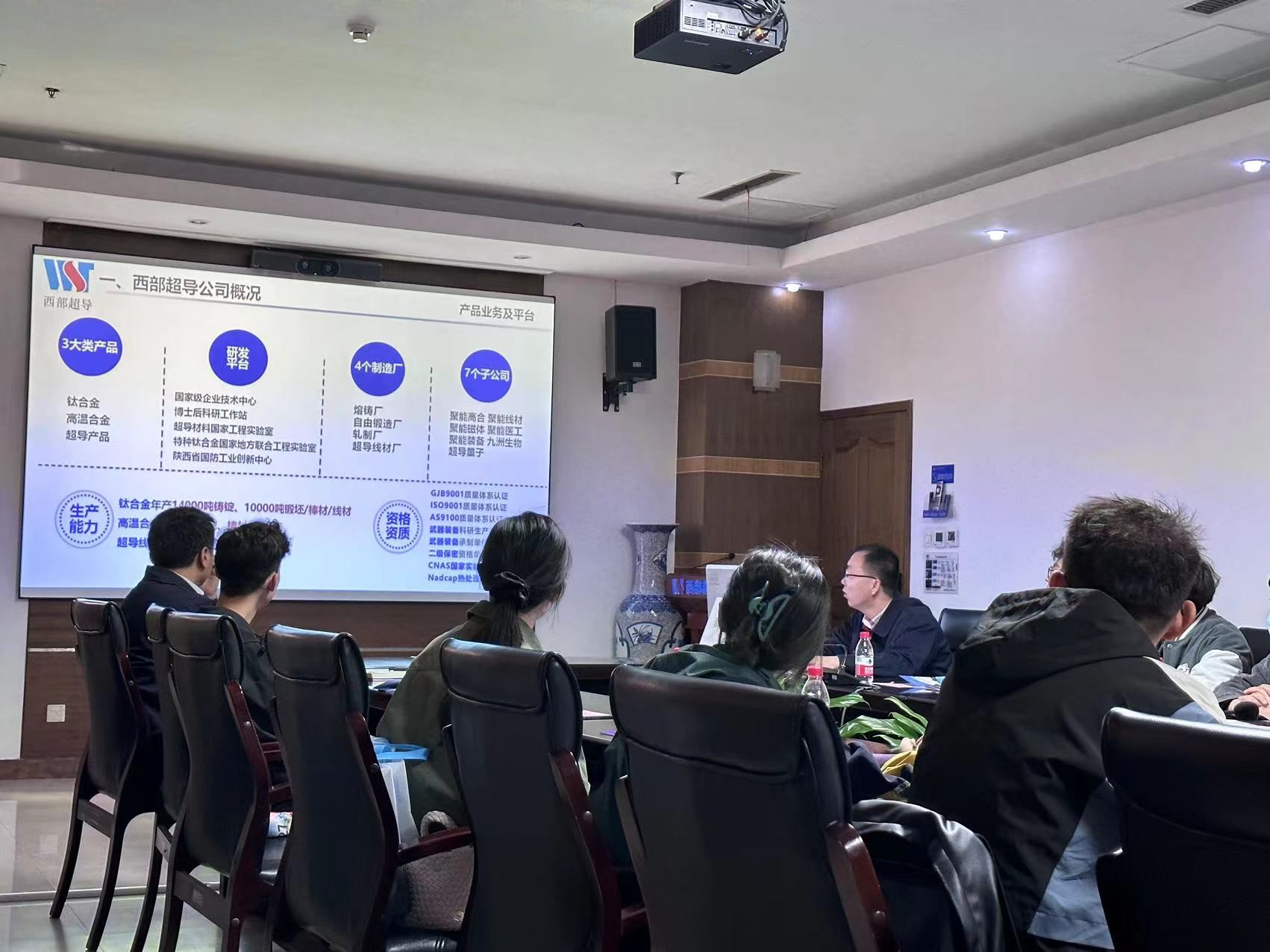为了进一步加强校企合作交流,推进校企协同育人发展,提高人才培养质量。3月31日下午,新葡的京集团8814教授、功能材料师生联合支部书记潘毅、新葡的京集团8814助理教授杨洋、新葡的京集团8814助理研究员张永强等师生代表20余人前往西部超导材料科技股份有限公司(以下简称:西部超导)参观交流。西部超导制造一厂副厂长何涛、西部超导研发部副部长杜玉俊、制造二厂型号副总师杨晶、制造四厂厂长助理武博等参加座谈,会议由西部超导公司组织人事部副部长王毓主持。
