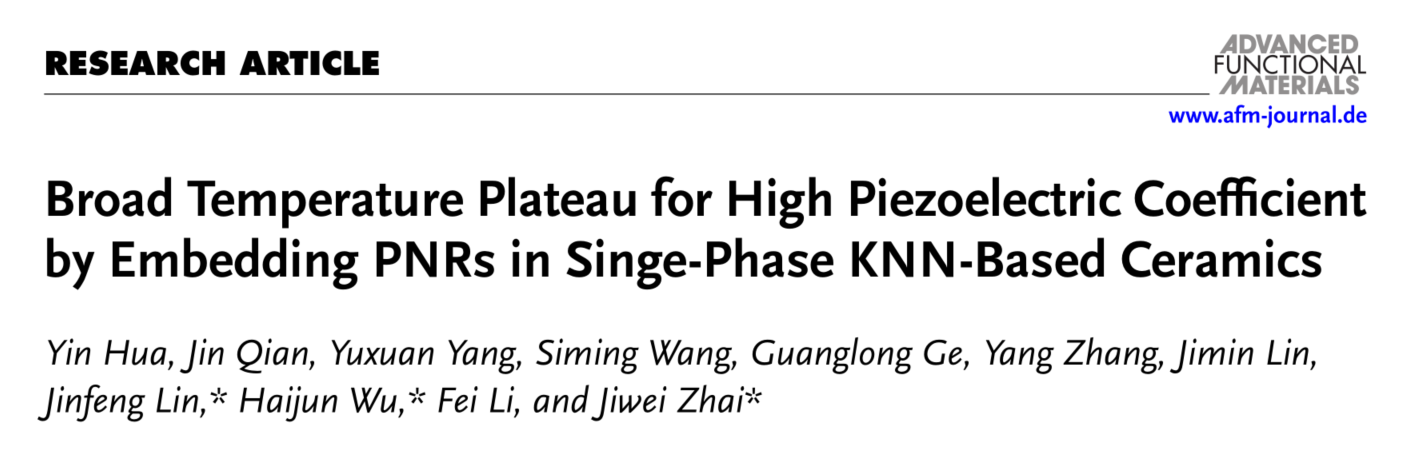 以上研究成果以“Broad Temperature Plateau for High Piezoelectric Coefficient by Embedding PNRs in Singe-Phase KNN-Based Ceramics”(“铌酸钾钠单相压电陶瓷中构筑极化纳米微区实现宽温域的高压电性能”)为题发表在《Advanced Functional Materials》(《先进功能材料》)上。西安交通大学在读博士生杨宇轩为共同第一作者,西安交通大学新葡的京集团8814武海军教授为共同通讯作者。西安交通大学分测中心张杨高级工程师为论文共同作者。本项研究工作得到了西安交通大学分析测试中心在聚焦离子束和球差校正电镜微结构表征方面的鼎力支持。