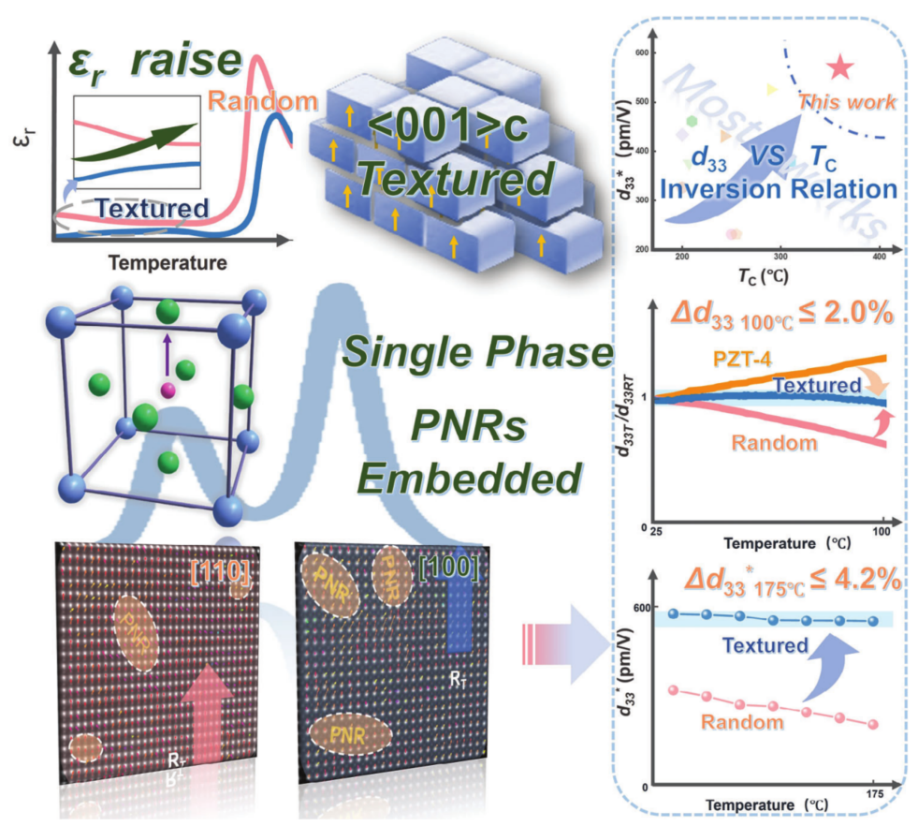 此外,课题组与同济大学通力合作,选择了具有高居里温度的0.99((K0.5Na0.5)(Nb0.98Ta0.02)O3)-0.01(Bi(Ni0.67Nb0.33)O3)作为基础体系,并利用第三组分(Bi0.5K0.5)HfO3(BKH)进行化学改性。BKH是线性电介质,有利于在KNN基陶瓷中引入弛豫态并扩散相变温度。然后通过织构技术进一步改善各向异性,以保持良好的压电性能。结果表明所制备的KNN基陶瓷不仅具有高度的织构取向和高的居里温度,而且成功地扩散并降低了TO-T相变温度,最终在室温单四方相0.96((K0.5Na0.5)(Nb0.98Ta0.02)O3)-0.01(Bi(Ni0.67Nb0.33)O3)-0.03(Bi0.5K0.5)HfO3-3%wt NaNbO3陶瓷基质中观察到极性纳米微区(PNRs)的嵌入。这种新型的多尺度结构使得KNN基陶瓷不仅保持了高居里温度(~ 365 °C)和高压电性能(d33 ~ 331 pC/N,d33* ~ 561 pm/V),同时还获得了优异的温度稳定性,如在25 °C到100 °C的温度范围内,其d33仅变化2.0%(~ 10.0%到200 °C),在25 °C到175 °C的温度范围内,其d33*仅变化4.2%(~ 9.8%到200 °C)。