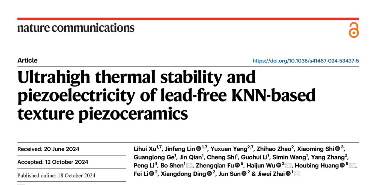 以上研究成果以“Ultrahigh thermal stability and piezoelectricity of lead-free KNN-based texture piezoceramics”(“兼具超高热稳定性和高压电性能的铌酸钾钠无铅压电织构陶瓷”)为题发表在《Nature Communications》(《自然通讯》)上。西安交通大学新葡的京集团8814在读博士生杨宇轩为共同第一作者,新葡的京集团8814武海军教授为共同通讯作者。新葡的京集团8814孙军院士和丁向东教授、新葡的京集团8814在读硕士生赵志昊、分测中心张杨高级工程师等为论文共同作者。该工作还得到了北京理工大学、北京科技大学、聊城大学、中科院上硅所等单位的支持。本项研究工作得到了西安交通大学分析测试中心在聚焦离子束和球差校正电镜微结构表征方面的鼎力支持。