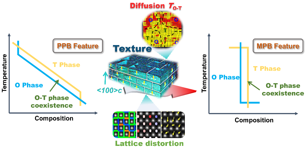 近日,我校新葡的京集团8814材料强度组武海军教授与同济大学研究团队在铌酸钾钠(KNN)基压电陶瓷中创新性地构建了一种具有MPB特征的扩散型PPB相界,用于协同优化压电系数及其温度稳定性。该相界的构建是通过将(Bi0.5K0.5)HfO3引入到0.97(Na0.56K0.44)NbO3-0.03Bi0.5Na0.5ZrO3基质中,并同时结合织构技术来实现的,其中Bi3+和Hf4+有助于扩散型O-T相界的初步形成,而织构技术由于诱导了畴尺寸的增长进一步改善了相界的温度稳定特性。另一方面,织构技术诱导的<00l>C晶体取向和O-T相界的构建可以促进电偶极子的有效翻转,保证了高的压电响应。所开发的(0.97-x)(Na0.56K0.44)NbO3-0.03Bi0.5Na0.5ZrO3-x(Bi0.5K0.5)HfO3(KNN-BNZ-xBKH)织构陶瓷不仅具有高的压电系数(d33 ~ 550 ± 30 pC/N),还呈现出超高的温稳定性(在25-150 °C的温度范围内变化率小于1.2%,在25-250 °C内变化率小于10%)。该工作为解决无铅压电陶瓷中高压电系数和温度稳定性不足之间的难题提供了重要思路。