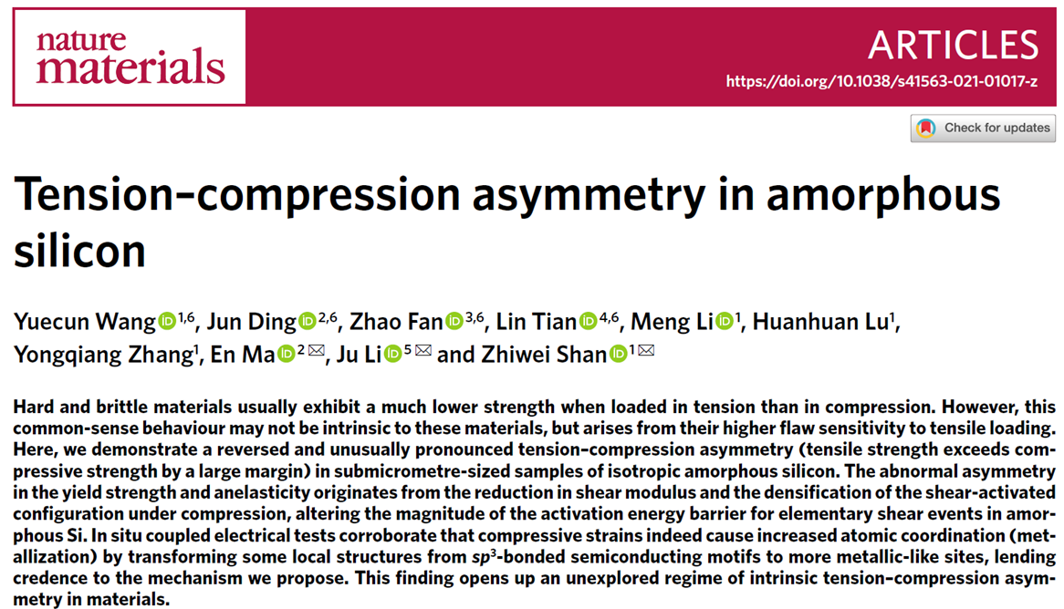 06-01硬脆材料通常表现为“拉弱压强”。近日,西安交大的研究工作发现,非晶硅本征的抗拉强度其实可以远高于其抗压强度,即在缺陷极少时表现出“拉强压弱”的“反常”不对称性。上述研究有望为硅基材料在微机电系统、微纳尺度柔性电子器件等中的应用提供指导。相关成果以“Tension-compression asymmetry in amorphous Si” 为题发表在最新一期的《自然×材料》杂志上,文章链接https://www.nature.com/articles/s41563-021-01017-z。...
