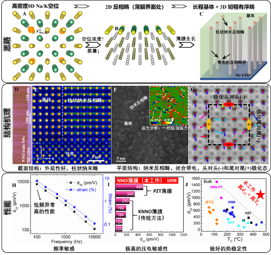 06-05无铅碱金属铌酸盐[KNNO或NaNbO3, NNO]因其优异的综合压电性能和环境友好等特性,有望替代有毒的铅基材料,被广泛应用在微电子机械系统(MEMS)的压电薄膜中。提高KNNO基压电薄膜性能的传统策略是通过复杂的组分设计来实现相界调控:将KNNO的相变调到室温附近,使长程铁电畴变成短程有序纳米畴,利用相界处的相共存特征优化压电响应,所获得的最高的压电系数d33 ~250 pC/N。但是该传统策略需要严格控制其复杂的组分,很难适用于含...